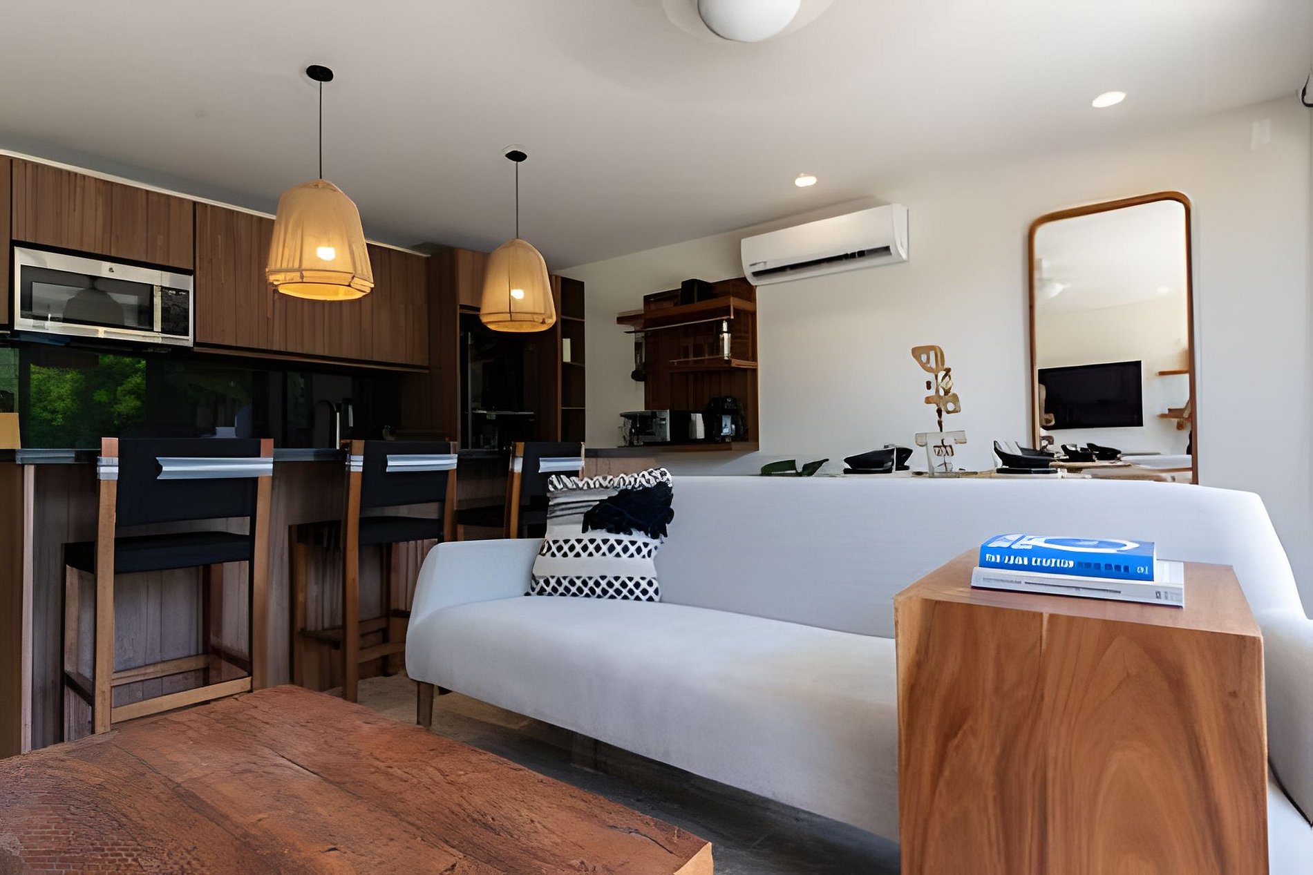 New and beautiful 2-bedroom apartment, decorated and designed for you to enjoy your stay to the fullest. It features a King bed and 1 pull-out personal bed, as well as a studio with a Queen bed. The apartment is located on the 1st floor and has a spacious balcony with a beautiful view of the swimming pool surrounded by lush greenery within the AWA Playacar development.